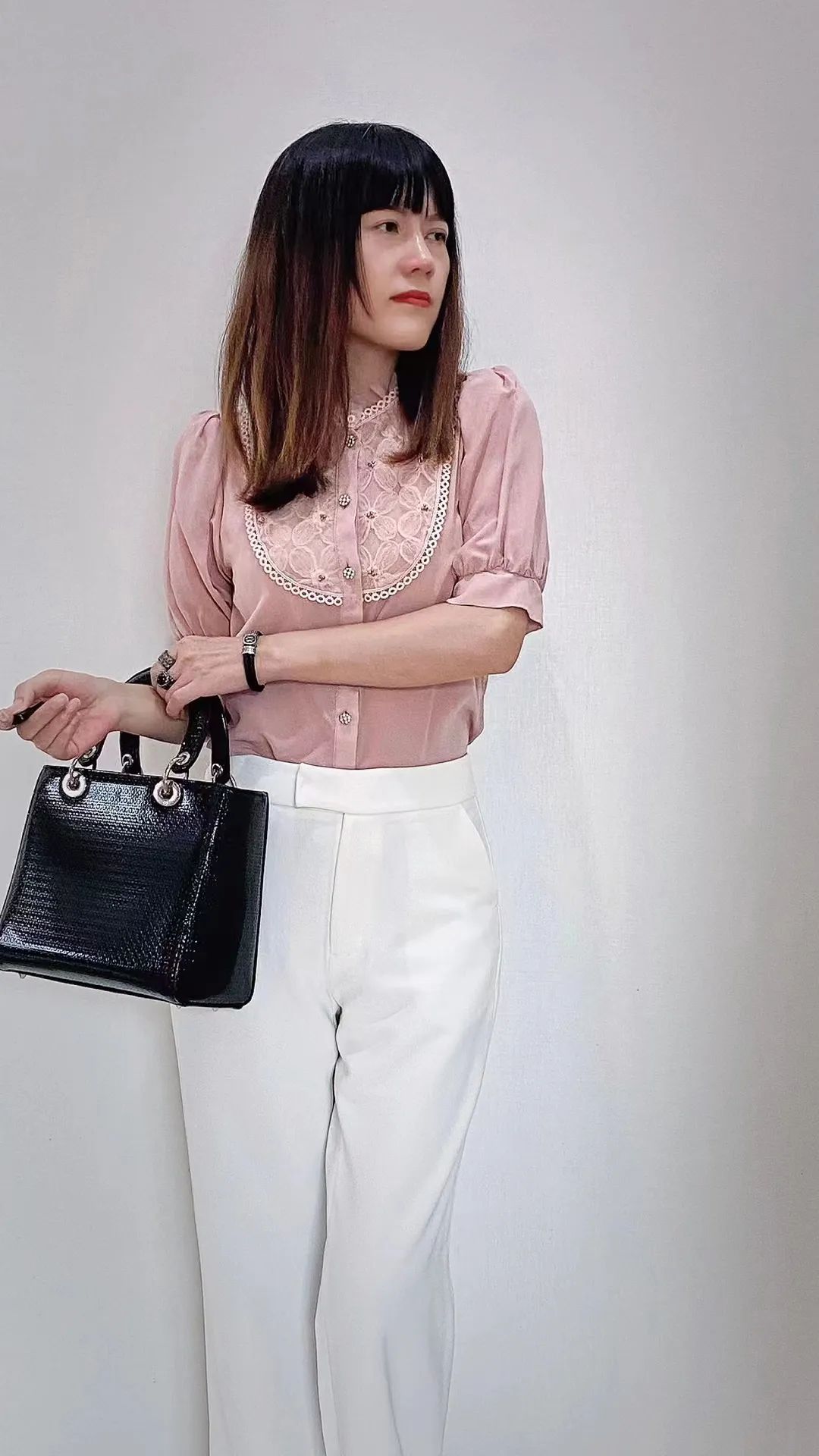 >>>> look2 粉色真丝宫廷风衬衣+白色直筒西裤
