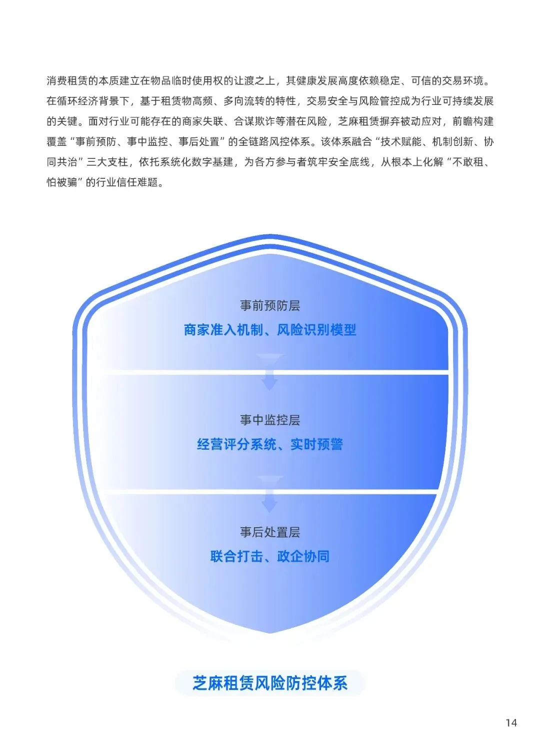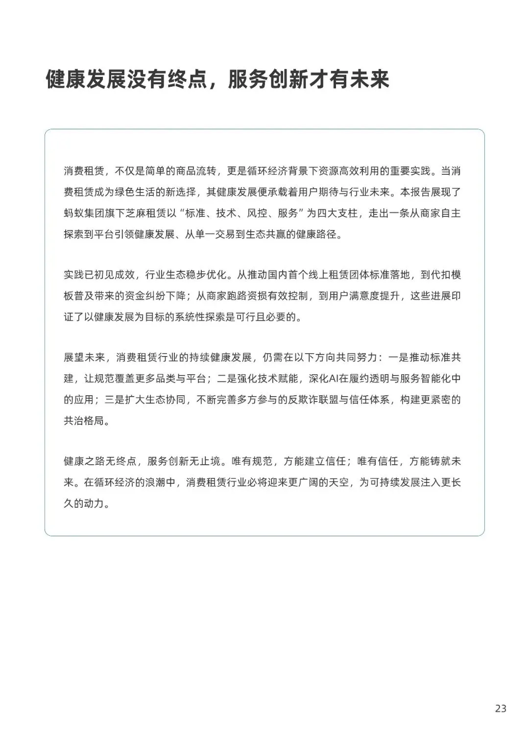 其数字化方案覆盖超2000家商家,提升交易透明度和效率;通过AI技术赋能,实现智能风控和服务优化;同时,建立全链路风控体系,保障用户和商家资金安全。报告强调,消费租赁作为绿色经济的重要组成部分,其健康发展需标准引领、技术赋能和生态协同。未来,行业应继续推动标准共建、强化技术赋能、扩大生态协同,以构建更紧密的共治格局,促进消费租赁行业的持续健康发展。