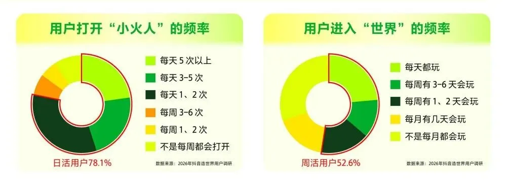 用户端是生态的核心基石,抖音造世界凭借 “合养精灵(小火人)” 和 “世界” 两大产品,成功撬动了核心年轻消费群体。截至 2026 年 2 月,小火人日活达 1 亿,世界上线半年累计用户突破 5000 万,且 81.6% 的用户来自抖音域内转化,足见其强大的用户渗透能力。平台核心用户以 18-30 岁群体为主,占比超七成,这一群体高互动、高粘性、消费观念开放,小火人日活用户占比近 80%,世界周活用户超半数。而用户的核心诉求,始终围绕社交链接与多元情绪价值展开 —— 小火人成为 “社交催化剂”,世界则在成就满足与治愈舒缓之间找到平衡,这种以社交为核心的情绪价值供给,让抖音用户从浅层娱乐向深度互动体验转型。