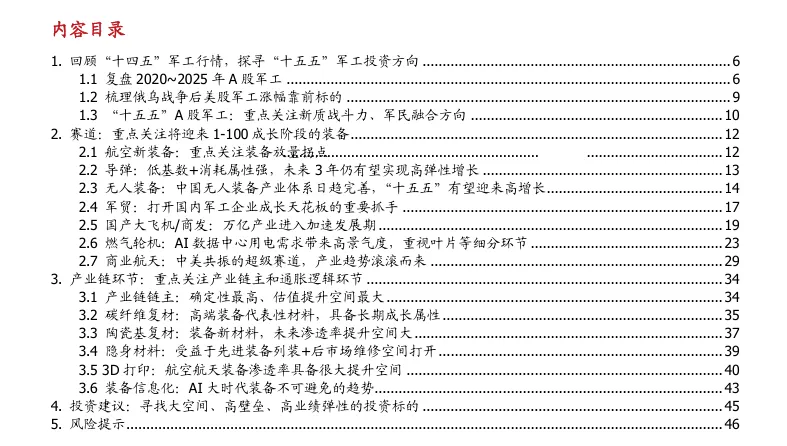 具体来看,航空新装备、飞弹、无人装备受益于技术迭代与放量需求,国防外贸领域中国装备经实战验证有望提升全球市占率,国产大飞机 / 商发进入万亿产业加速期,燃气轮机受 AI 数据中心用电需求拉动迎来高景气,商业航天中美共振成超级赛道,装备信息化随 AI 发展持续深化。产业链环节重点布局产业链链主及碳纤维复材、陶瓷基复材、3D 打印、隐身材料等通胀逻辑环节,此报告同时梳理了各赛道核心标的,为投资者提供全面决策参考。