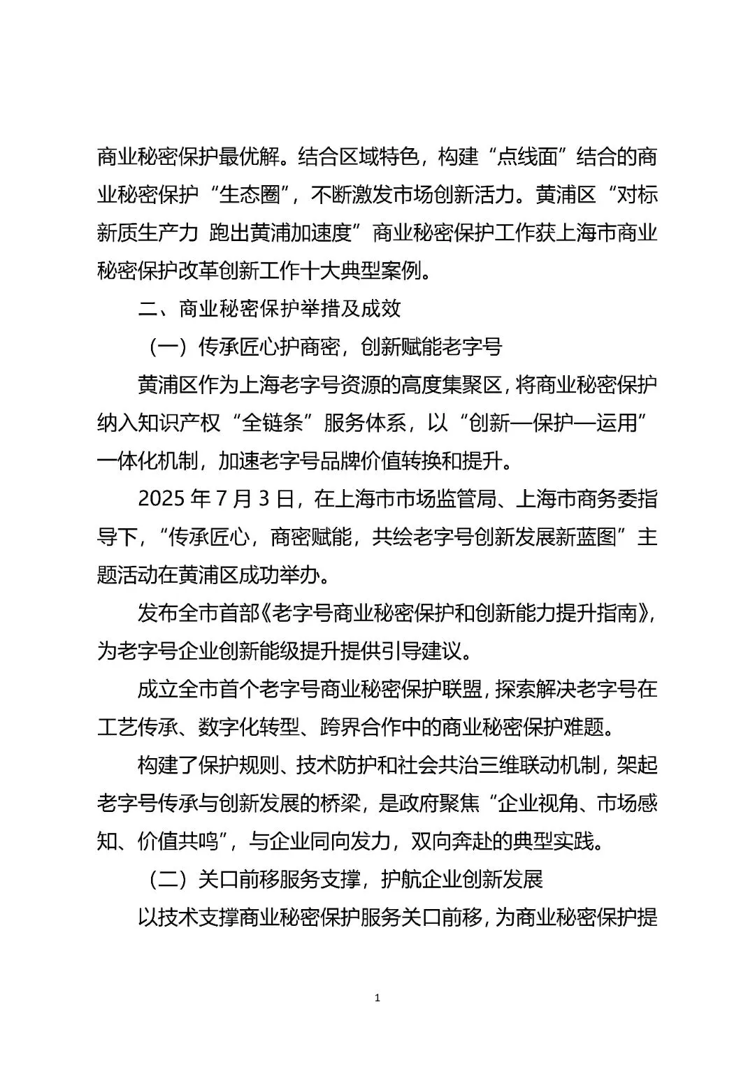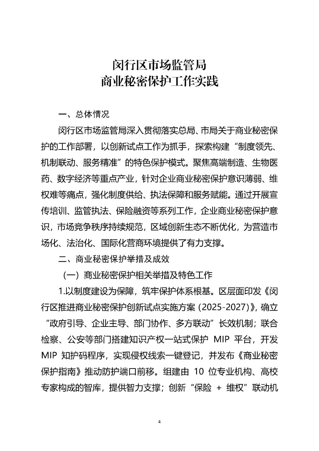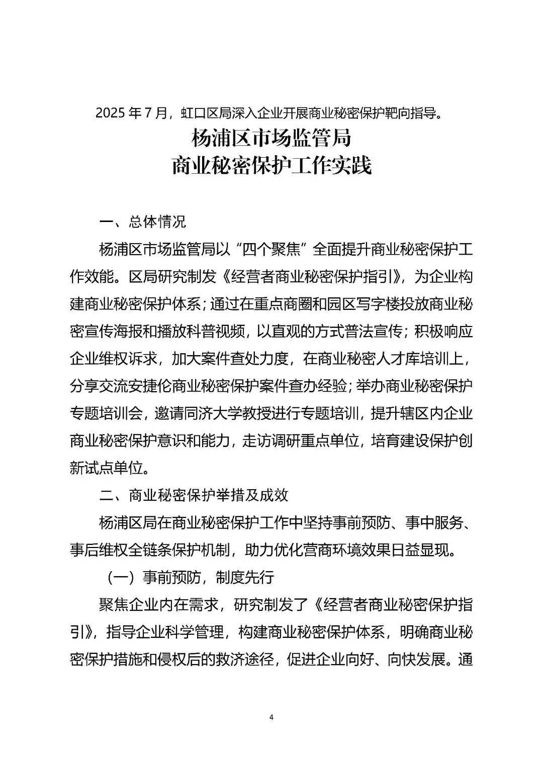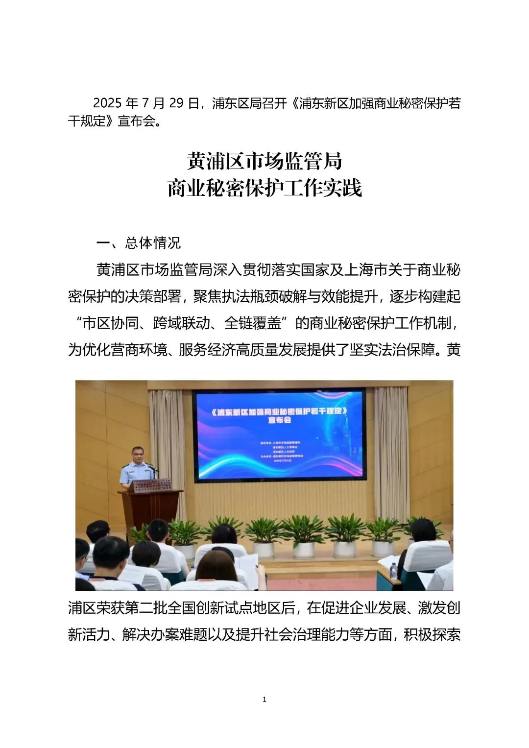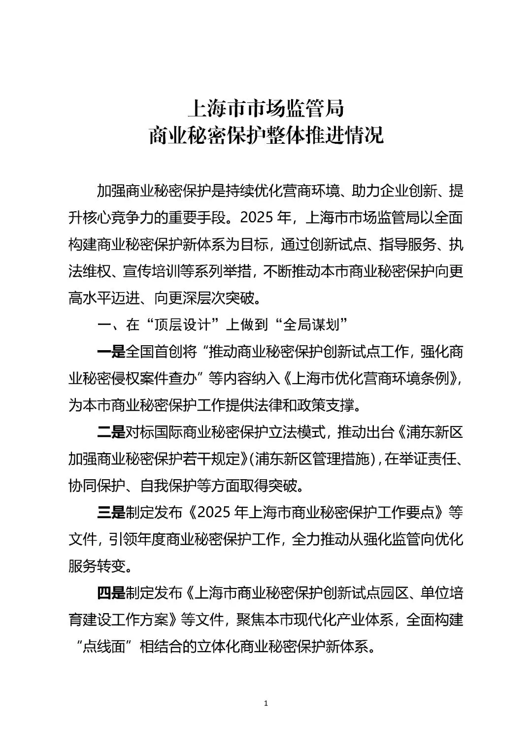 商业秘密是企业创新发展的核心资产,也是优化营商环境、激发市场活力的重要支撑。上海市场监管部门聚焦制度引领、精准服务、执法维权、创新试点,着力构建 “点线面” 结合、全链条、立体化的商业秘密保护体系。