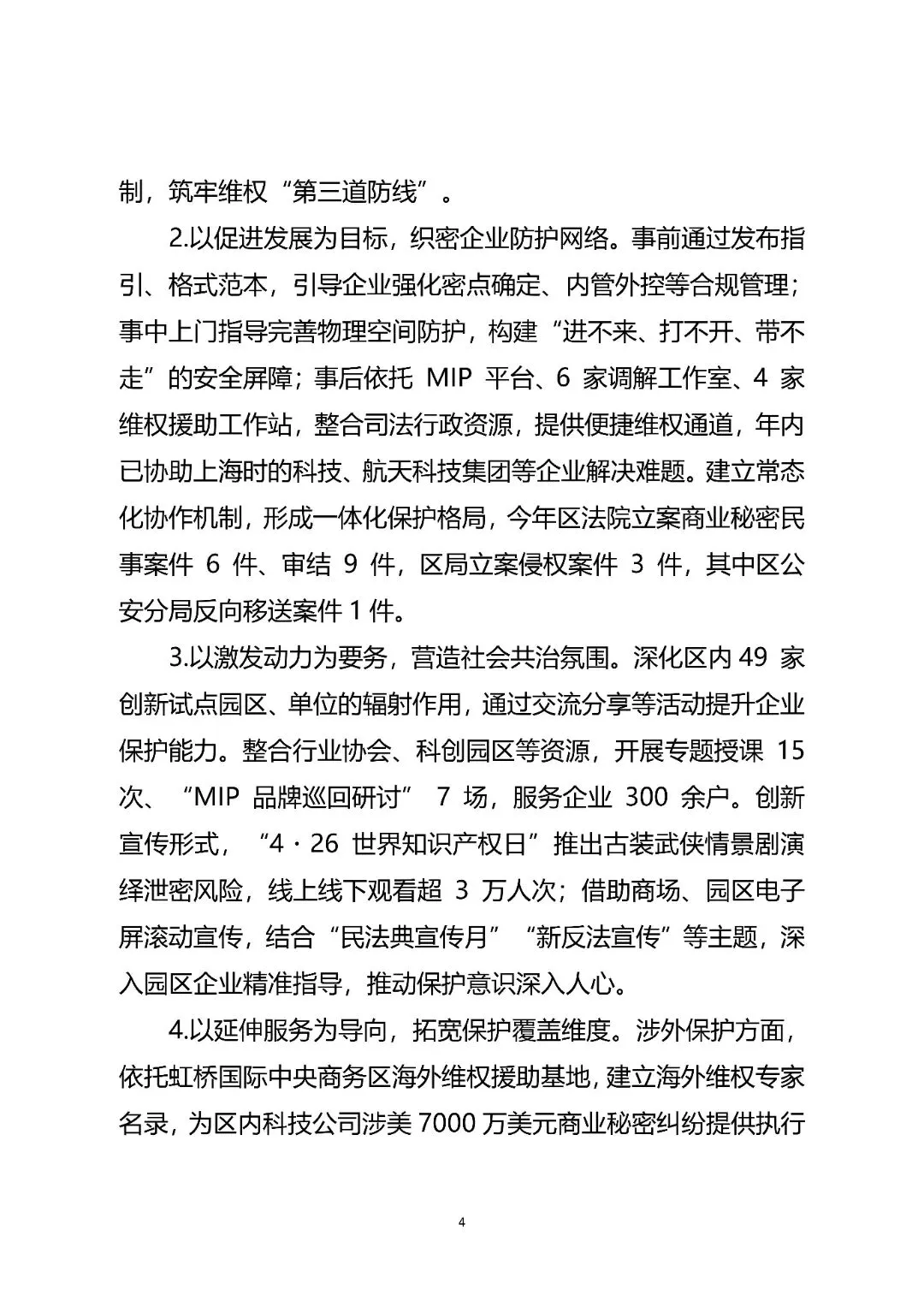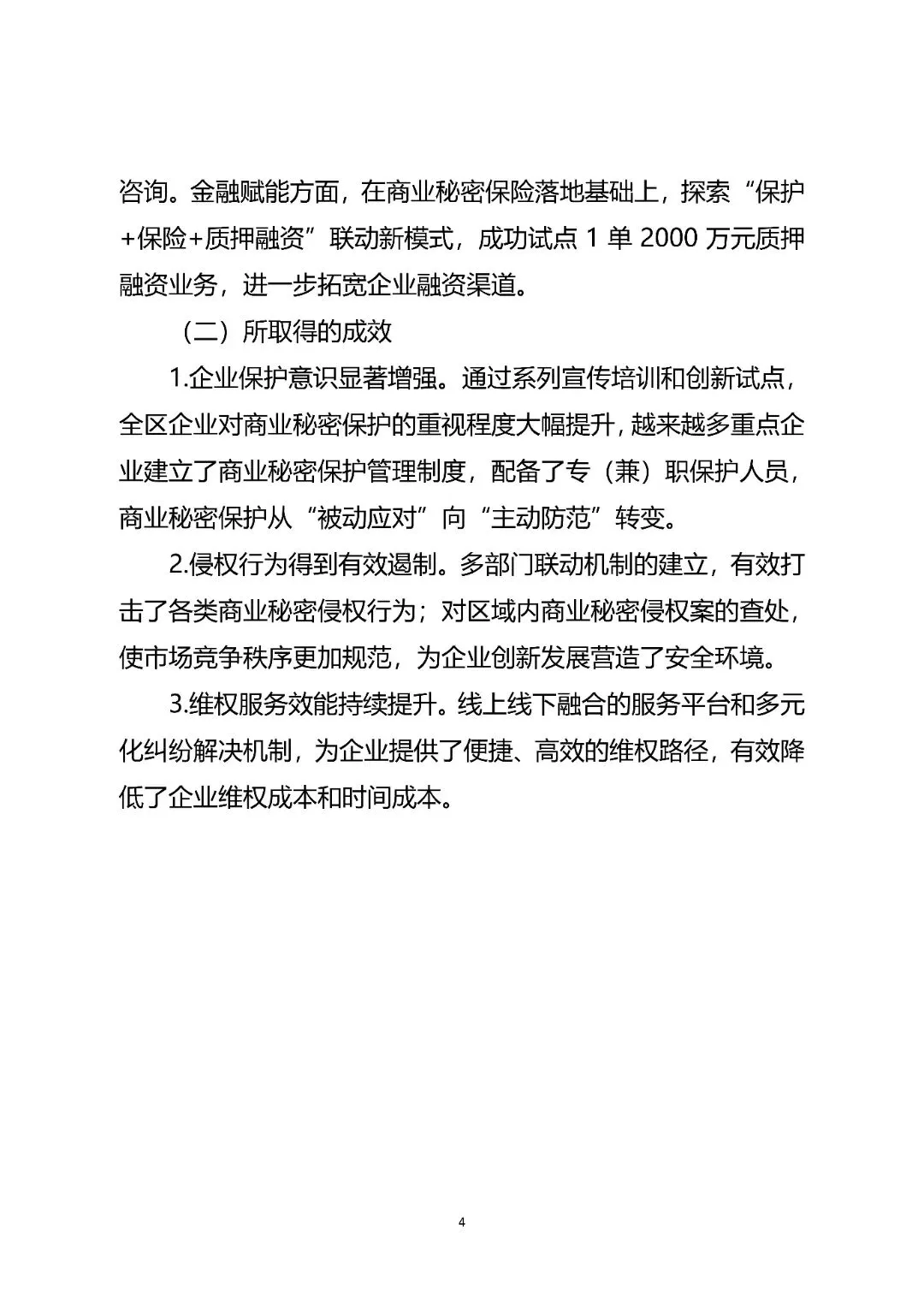 制度创新上,将相关工作纳入营商环境重点任务,率先出台《浦东新区加强商业秘密保护若干规定》实现关键环节突破;涉外保护方面,编制海外保护指南及案例评述,举办研讨会并组建海外纠纷应对指导专家库,助力企业出海;试点布局全域覆盖,4个区入选全国创新试点,市、区两级试点园区及单位超600家,覆盖重点企业及科创主体。