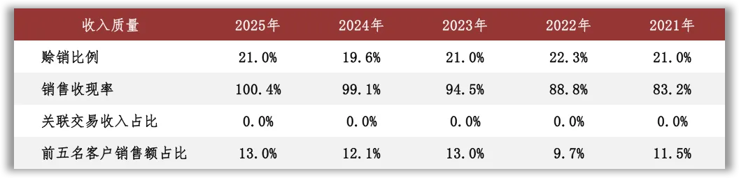 观察收入质量,赊销比例和销售收现率应予以关注。2025年末,公司应收账款余额9.89亿元,已计提的坏账准备比例为9%;账龄在1年以内的款项占比95%。2025年末公司前五名欠款方应收账款余额合计为1.69亿元,占应收账款总额的比例为17.13%,已计提的坏账准备比例为10%;其中第一名欠款方应收账款余额占应收账款总额的比例为5.73%。
