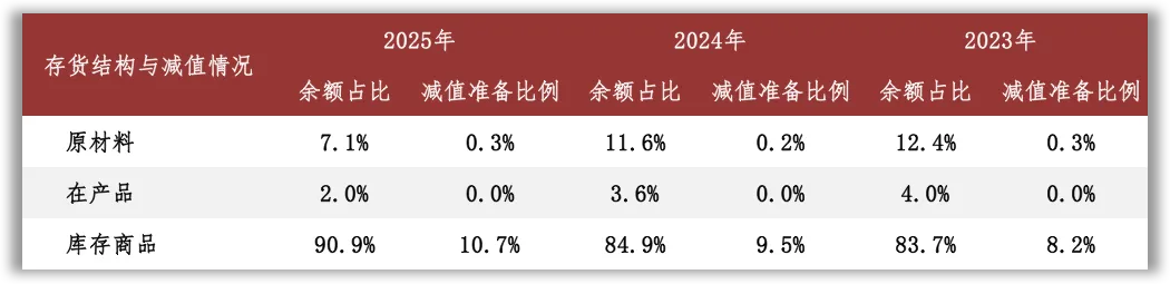 核心资产中重点关注存货和固定资产等。根据2025年报数据,存货账面余额中库存商品占比91%;以近三年的平均营业成本为基数进行计算,2025年末库存商品的周转天数为166天。