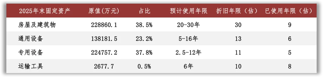 根据2025年报数据估算,房屋及建筑物在固定资产中占比39%(按原值计算,以下同),折旧年限约为30年,已使用年限约为9年。作为对照,看一下土地的已使用年限:根据2025年报数据估算,土地使用权在无形资产中占比98%,摊销年限约为48年,已使用年限约为10年。