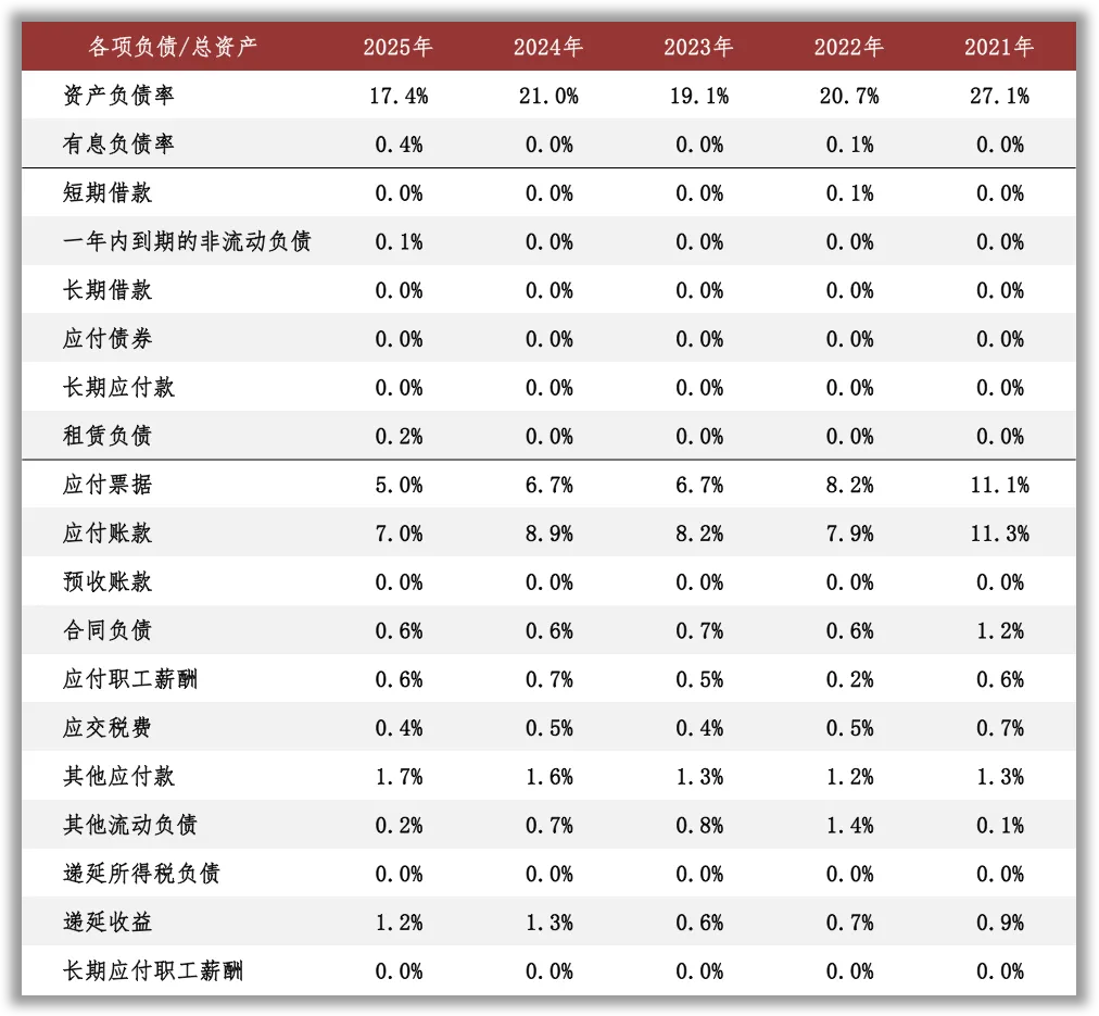 截至2025年末,公司资产负债率17%,有息负债率几可忽略,无重大对外担保。