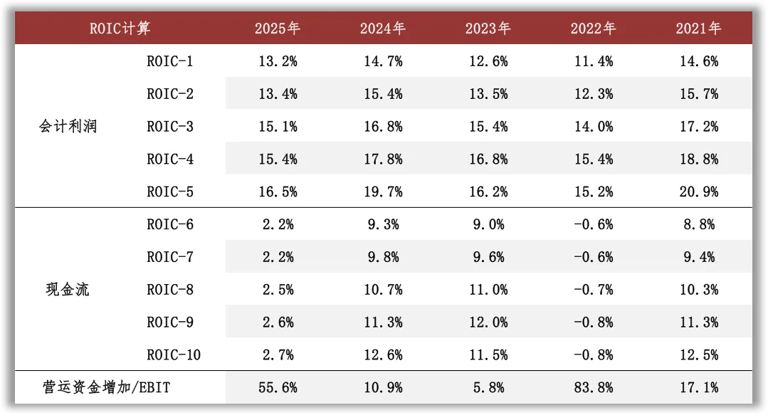 2025年按现金流计算的ROIC显著低于按会计利润计算的ROIC,会计利润和现金流的差额主要来自营运资金投入。根据年报中的说明,2025年公司经营活动产生的现金流量净额同比减少50.48%,主要原因为销售商品、提供劳务收到的现金减少;观察现金流量表补充资料,2025年营运资金增加主要归因于存货占用的资金增加以及应付/预收项目金额减少。