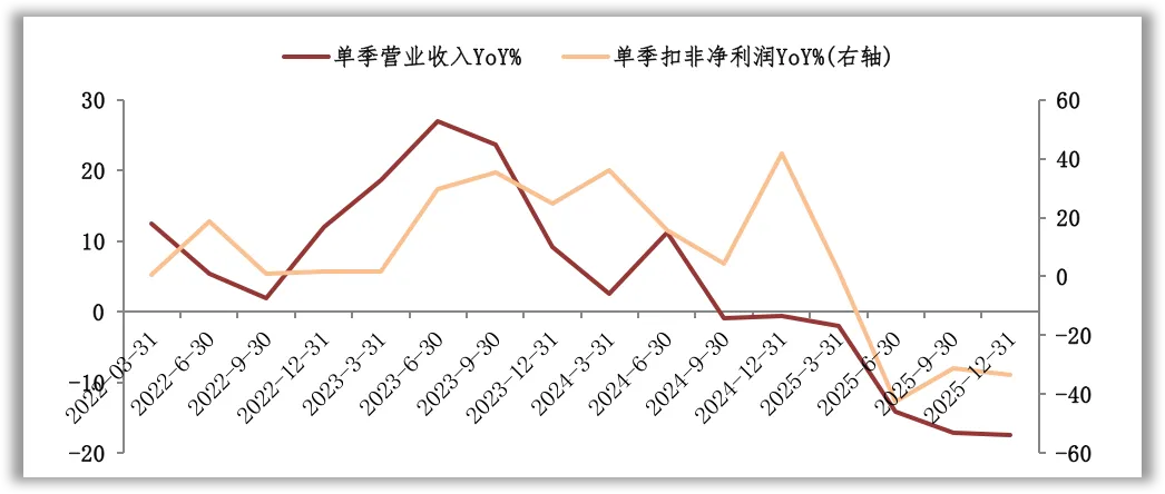 观察营收增速与扣非净利润增速的变化,近三年营收增速的低点出现在2025年四季度,扣非净利润增速的低点出现在2025年二季度。根据财报中对经营情况的分析,影响景气度的外部因素包括产业政策、市场竞争、全球地缘政治格局等。