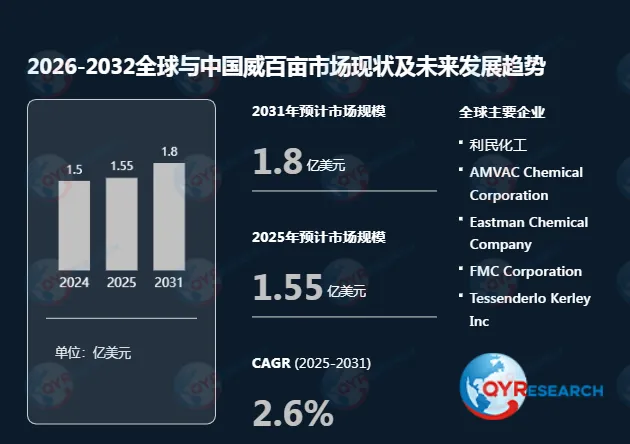 根据QYR(恒州博智)的统计及预测,2025年全球威百亩市场销售额达到了1.55亿美元,预计2031年将达到1.8亿美元,年复合增长率(CAGR)为2.6%(2025-2031)。