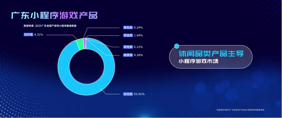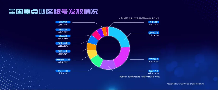 报告显示,2025年全球游戏市场营收规模1888亿美元,同比增长3.4%。目前移动端游戏仍然占全球游戏市场最大份额。2025年中国游戏用户规模创下6.83亿的新高,同比增长1.35%,达到历史新高点。2025年广东游戏营收规模2836.13亿元,同比增长8.9%,增速较去年有所增加。2025年广东省移动游戏营收规模2116.32亿元,较2024年上涨7.55%.2025年广东客户端游戏营收规模达696.55亿元,同比增长15.78%。2025年广东小程序游戏营收规模达370.46亿元,同比增长40.9%。除了游戏营收之外,《报告》还分析了过去一年的产业热点,如全球产品力突破、政策引领、技术赋能、社会认知、产业协同以及情感认同消费等。2025年,截止到11月,全国重点地区版号发放情况如下,数量最多的是上海393款、占比24.2%,其次是广东320款、占比19.7%;再者是北京210款、占比12.93%。之后是四川151款、占比9.33%;海南101款、占比6.22%;江苏100款、占比6.16%;浙江89款、占比5.48%;福建62款、占比3.82%;湖北53款、占比3.26%;天津30款、占比1.85%;最后是其他地区115款,占比7.08%。根据2025年1月至11月的榜单数据,国内移动游戏收入TOP100榜单中,广东有61款产品上榜,产品收入占比高达75.74%。在国内移动端新游收入TOP30榜单中,广东有12款产品上榜,产品收入占比达84.73%。从品类分布来看,2025年广东移动游戏产品中占比最高的是角色扮演类,占比35%,其次是休闲类,占比24%,再者是策略类,占比11%、模拟类占比10%、动作类占比8%、射击类占比5%、运动类占比4%、赛车类占比2%和音乐类占比1%。根据微信平台小游戏品类分布情况来看,2025年,广东小游戏产品以休闲游戏品类为主导,占比93.91%。其次是动作、竞技、棋牌,占比分别4.31%、1.04%、0.38%。小程序游戏畅销榜TOP30中,七款来自广州的产品入榜,分别是《寻道大千》《青云诀之伏魔》《主宰世界》《这城有良田》《时光杂货铺》《时光大爆炸》《英雄没有闪》。另外入榜的七款游戏则来自深圳:《向僵尸开炮》《百炼英雄》《神器传说》《腾讯欢乐斗地主》《保卫向日葵》《武侠大明星》《欢乐战三国》。游戏企业的上市情况。这个上市企业包含了新三板的上市企业,广东总共有27家,主要是集中在广州和深圳,其次是北京,有22家。福建有14家,排在第三,上海和浙江分别有10家。广东的27家游戏上市企业里港股有13家,A股有9家,美股有2家,新三板有3家,这个就是目前广东游戏上市企业的基本情况。