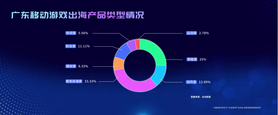 2025年,国内游戏行业共发生147起投融资事件,无论投资人还是被投主体分布上,前三甲均为广东、上海和北京。其中,广东游戏行业发起的融资事件46起,占比28.39%。被投的企业也多达34家,均为第一。企业端,微信平台小游戏开发者重点区域分布中,广东占比17.43%,福建、湖南、四川次之,占比分别为7.27%、7.27%、6.6%。在2025年中国小程序游戏百强企业属地Top5中,广东企业占据半壁江山,广州多达32家,深圳20家、北京14家、杭州和上海5家。2025年广东游戏出海营收规模达464.27亿元,同比增长9.6%。广东出海游戏品类分布上,仍然是以角色扮演类占比最高、占比33.33%,其次是策略类25%,而休闲类仅占5.56%。动作类占比13.89%,射击类占比11.11%,模拟类占比8.33%,运动类占比2.78%。《报告》分析称,新一年广东游戏出海面临的挑战有几点:文化认同鸿沟,导致产品竞争力与溢价能力不足;合规风险高企,迟滞市场拓展与新品爆发入局小游戏企业增加;市场竞争激烈,存量市场中突围艰难;用户获取成本高,侵蚀利润并压制新品表现;本地化运营薄弱,制约用户沉淀与长期价值;龙头企业全球化路径依赖,投资驱动与自研出海失衡。报告同时指出,广东游戏产业呈现政策引领、硬核出海、AI融合等六大趋势,广深“双核”引领大湾区协同发展,产业正从“产品经营”迈向“情感经营”,持续巩固全国游戏产业“领头羊”地位。