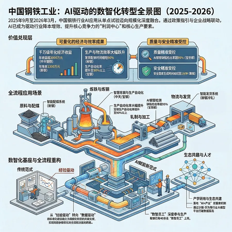 总结而言,本报告期内的政策与战略环境呈现出“国家指引方向、行业树立标准、企业重兵投入、生态协同共建、资源全局联动”的鲜明特征。 这不仅为钢铁行业的数智化转型提供了强大的制度保障与市场牵引,也预示着这场以AI为核心的产业变革,其影响已超越单个工厂或企业,正深度融入国家新质生产力培育与全球资源再配置的宏大叙事之中。