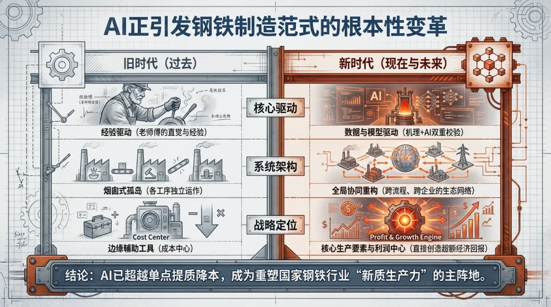 总而言之,中国钢铁行业的数智化转型,已成为观察 “AI+实体经济” 全球实践的一个重要窗口。它既承受着全球资源再配置带来的成本压力,也敏锐捕捉着下游新兴产业创造的市场机遇,更通过在开放生态中的积极探索,参与到全球工业智能化范式的塑造进程之中。