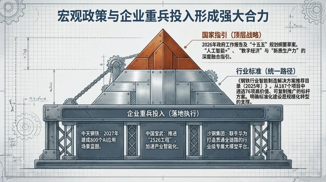 本报告期的转型实践紧密呼应了国家层面的战略部署。2026年政府工作报告及“十五五”规划纲要草案中关于 “人工智能+”、“数字经济” 和 “新质生产力” 的论述,为钢铁等传统产业的升级提供了清晰的战略指引。政策层面强调将AI深度融入实体经济,以此作为培育新质生产力的核心抓手,这直接锚定了钢铁行业向数据与算法驱动转型的大方向。
