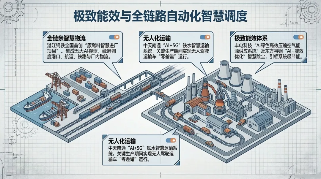 全链条智慧物流:湛江钢铁上线的 “原燃料智慧进厂项目” 堪称 “全国首创的全链条AI示范应用” ,该项目集成五大AI模型,实现了从计划、调度到卸船的全流程智能决策与协同。中天南通公司的 “AI+5G”铁水智慧运输系统在关键生产期间实现无人驾驶运输车“零差错”运行,保障了生产连续性与安全性。