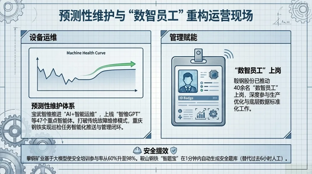 “数智员工”赋能现场:鞍钢股份通过“数据+AI重新定义钢铁制造流程”,已推动40余名“数智员工”上岗,深度参与生产优化与决策。宝武集团的共享员工也借助AI工具开发实用小程序,提升现场工作效率。
