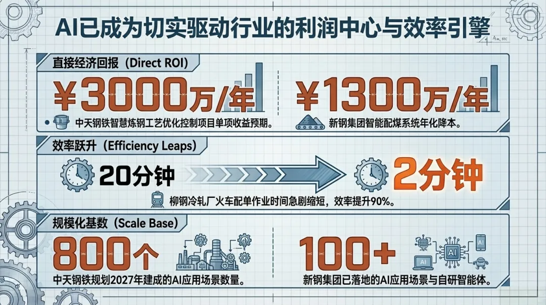 新钢集团的智能配煤系统通过AI模型自动出具最优配煤方案,实现年化降本1300万元。