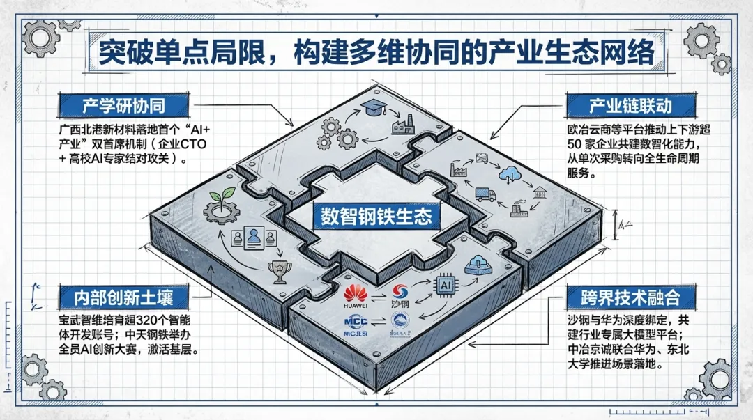 机制化协同创新:广西北港新材料公司落地了广西首个“AI+产业”双首席机制试点,由企业的首席技术官与高校的首席AI专家结对,形成校企协同攻关的稳定模式,旨在赋能特钢产业高质量发展。中冶京诚则与华为、东北大学三方签约,共同推进“AI+钢铁”新场景的落地与推广。
