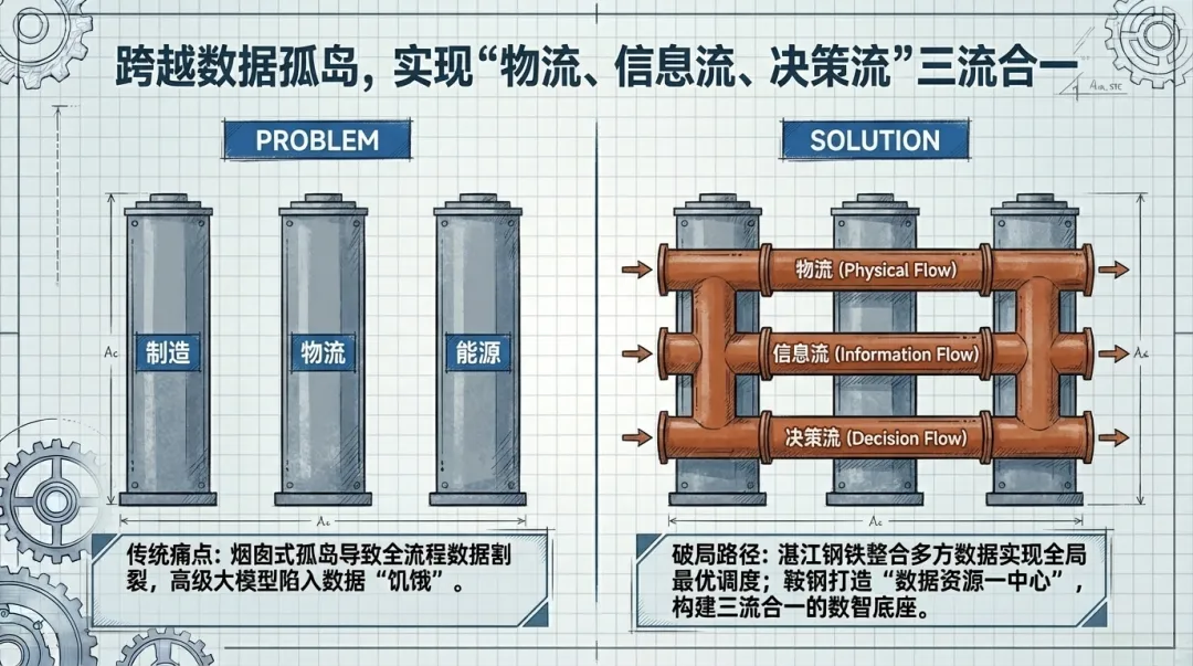 具体制约体现:在湛江钢铁“原燃料智慧进厂项目” 实施前,制造、物流、铁区、原料等环节独立运作,信息不互通,无法实现全局最优调度。项目的成功,正是通过集成五大模型,将独立环节“紧密串联、协同管理”,才实现了物流、信息流、决策流的“三流合一”。沙钢与华为联合启动的行业AI大模型项目,其前提便是“深度整合企业内部全维度生产运营数据...打破内外部数据壁垒,构建统一的数据治理与模型应用体系”。鞍钢股份同样直面“不同厂区的系统互不联通、大量数据沉睡难以利用”的痛点,通过打造统一数智底座“鞍云智鼎”,构建“数据资源一中心”,为后续AI应用奠定基础。