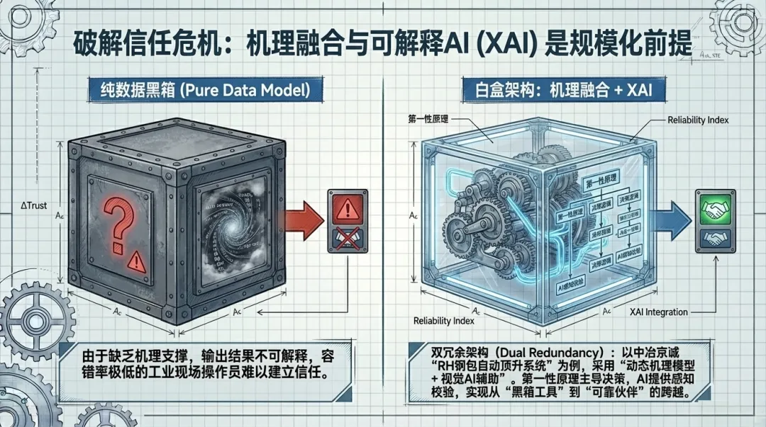 机理融合与可解释性(XAI)成为关键:工业现场对安全与稳定性的要求极高,纯粹数据驱动的“黑箱”模型难以获得工艺人员的信任。中冶京诚“RH钢包自动顶升系统” 采用“模型+视觉”双冗余架构,其中基于真空冶金机理的动态模型主导决策,“京诚智瞳”视觉模块辅助校验,是机理模型与AI感知深度融合的典范。国际专家观点与此呼应:Primetals Technologies的Petra Krahwinkler指出,团队正致力于结合“第一性原理训练与机器学习”,并研究“可解释AI(explainable AI)”,以提升AI结论的可靠性及人类的信任度,这是实现更高自主性的核心。