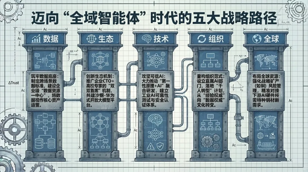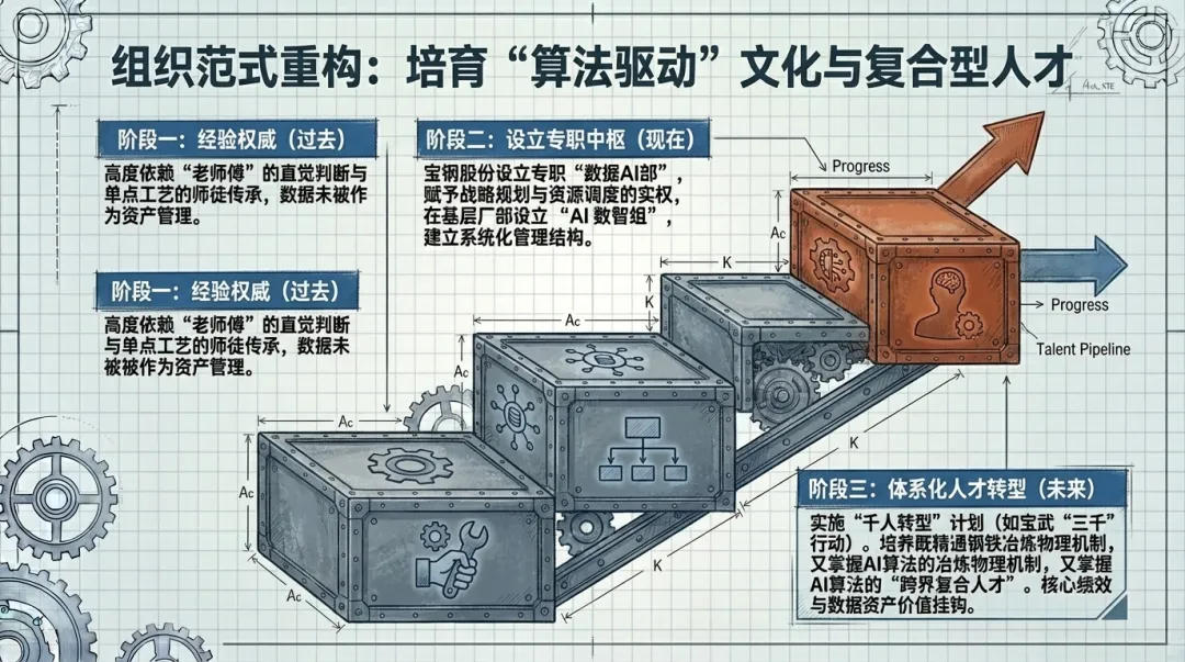 人才与组织范式重构:既懂钢铁工艺又精通AI算法的复合型人才极度稀缺。领先企业正通过设立专门机构(如宝钢股份的数据AI部)、实施大规模人才转型计划(宝钢“千人转型”)来应对。更深层的挑战在于组织范式的转变。宝钢股份明确指出,AI正推动公司从“经验驱动”向“算法驱动”进行“范式重构”。这要求企业的管理流程、决策机制和文化与之适配。