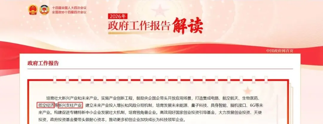 2026年全国两会胜利闭幕,低空经济连续第三年被写入政府工作报告,并首次明确提升至“新兴支柱产业” 战略定位,与集成电路、航空航天、生物医药并列布局,标志着我国低空领域迈入规模化、规范化、体系化发展新阶段。