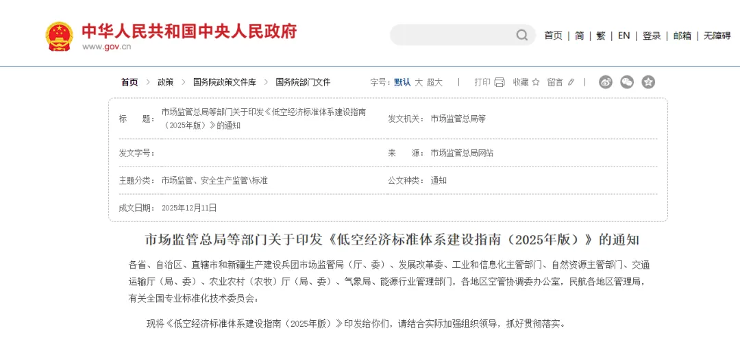 2026年初,市场监管总局、中央空管办、国家发改委等十部门联合印发《低空经济标准体系建设指南(2025 年版)》,与政府工作报告形成 “战略 + 标准” 组合拳。