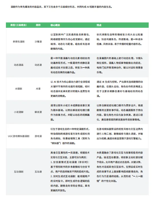 入局者多元:传统短剧团队、影视公司、网文平台、AI 技术厂商跨界入局,相关企业数量预计突破数十万家。 生产工业化:形成 “IP 输入 - AI 生成 - 后期剪辑” 标准化流程,5-7 人小组即可量产,月在投剧目超 2 万部,沙雕漫、解说漫供给占比超 80%。 题材集中爆发:玄幻、奇幻、末世等 “逆袭” 题材领跑,女频内容占比从 Q3 的 10% 升至 Q4 的 30%,潜力巨大。