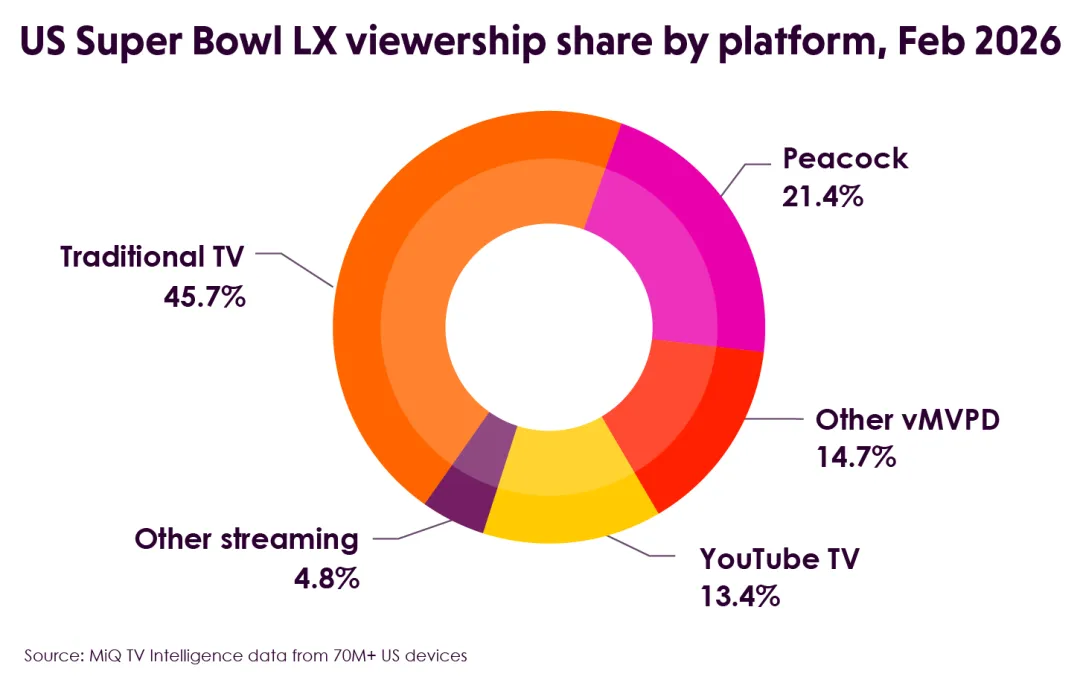 在 2026年 第60届 超级碗 (Super Bowl LX) 的直播中,首次有超过一半的美国家庭通过流媒体观看比赛。传统的有线电视和广播电视,第一次在这场国民级直播事件中被反超。