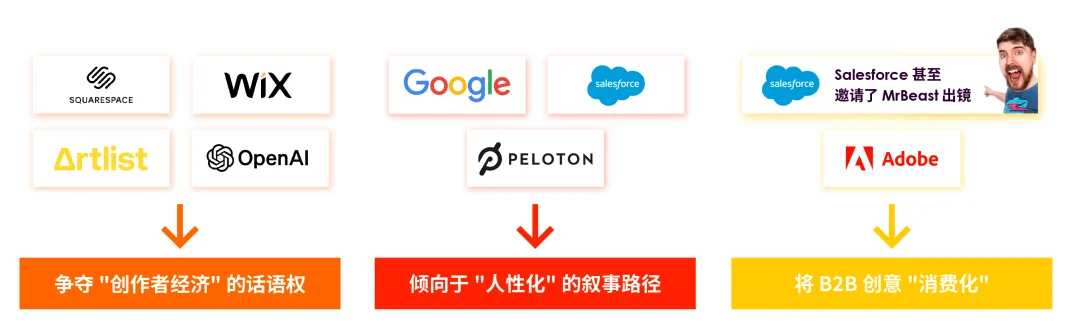 Squarespace、Wix、Artlist 和 OpenAI 等品牌竞相争夺 "创作者经济" 的话语权;谷歌、Salesforce 及 Peloton 则倾向于 "人性化" 的叙事路径,试图赋予 AI 以情感温度,而非冷冰冰的技术抽象;Salesforce 和 Adobe 更是将 B2B 创意 "消费化",前者甚至邀请了 MrBeast 出镜。