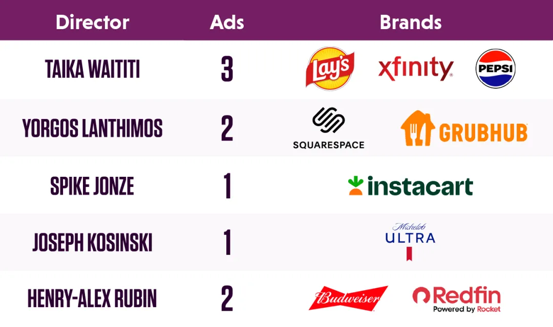 创意的投入同样匹配这份野心。Taika Waititi 操刀三支广告 (乐事、Xfinity、百事),Yorgos Lanthimos 指导两支广告 (Squarespace、Grubhub), Spike Jonze、Joseph Kosinski 以及 Henry-Alex Rubin 则分别掌镜 Instacart、Michelob ULTRA 和 Redfin/Rocket 的广告片。