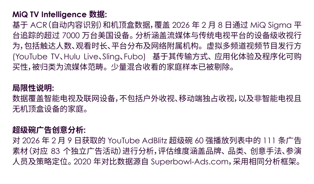 MiQ 通过对 7000 余万台电视设备的收视数据分析,我们梳理了 2026 年 2 月 8 日超级碗周日的美国家庭收视格局。