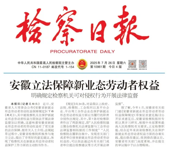 《检察日报》头版报道《安徽省新就业形态劳动者权益保障规定》