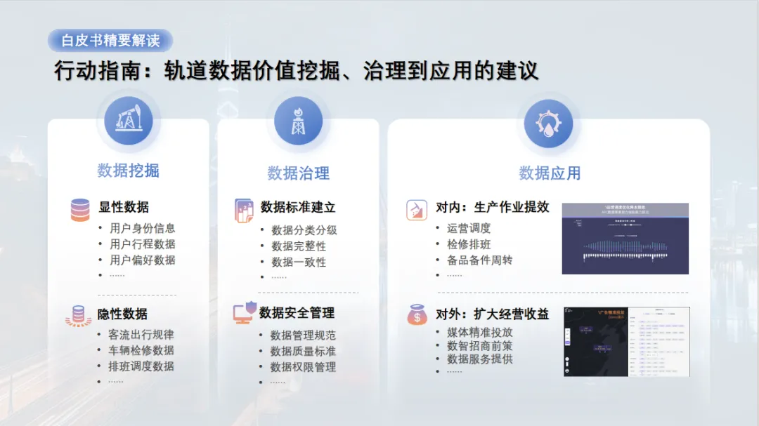数据应用:对内用于运营调度、检修排班等提效,对外用于媒体精准投放、数智招商等扩大经营收益。