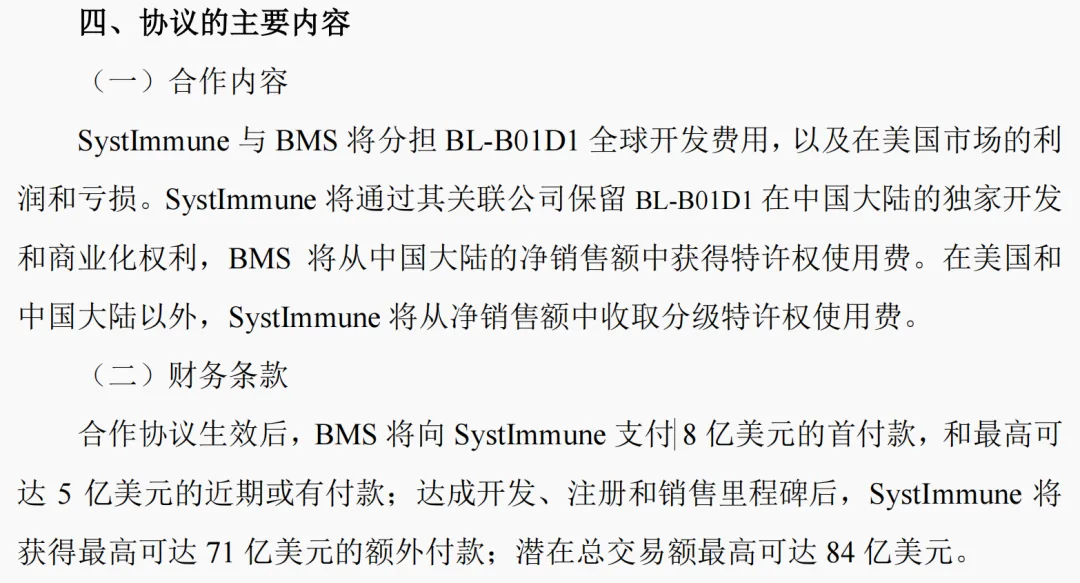 下面是公告的与BMS关于BL-B01D1的主要内容,协议主体SystImmune是公司在美国的子公司。