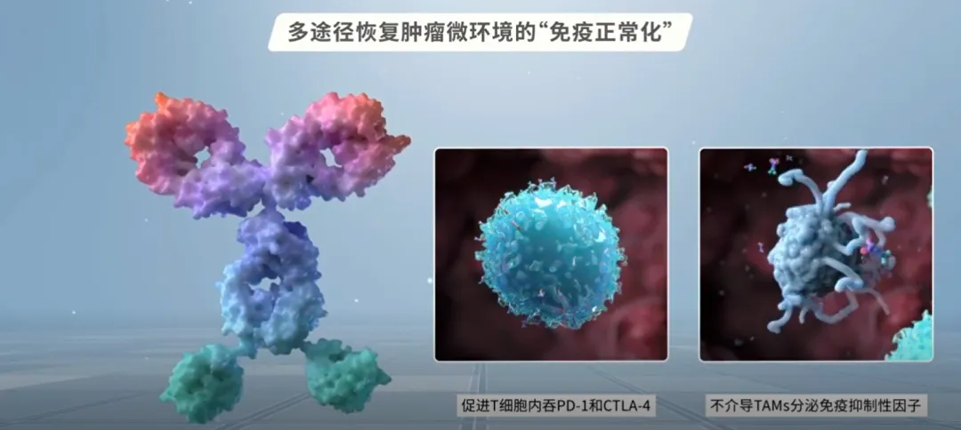 卡度尼利单抗通过Fc段结构改造实现了Fc效应沉默,消除了诱导巨噬细胞分泌白介素6(IL-6)和白介素8(IL-8)的ADCR活性,避免肿瘤相关巨噬细胞带来的免疫抑制效应。与此同时,卡度尼利单抗通过不断诱导免疫细胞分泌白介素2(IL-2)和伽马干扰素(IFN-Y)等肿瘤杀伤因子持续消灭肿瘤细胞。由此可见,卡度尼利单抗能全面兼顾地解除细胞内外的多种肿瘤免疫抑制性因素,多途径恢复肿瘤微环境的“免疫正常化”,使肿瘤细胞无处遁形。