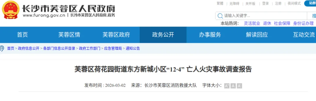 2025年12月4日19时24分许,长沙市消防救援支队“119”指挥中心接到报警称:湖南省长沙市芙蓉区荷花园街道东方新城社区东方新城小区一住宅发生火灾,本次火灾造成房屋装修、设备及其他财产受损,过火面积约8平方米,1人死亡。