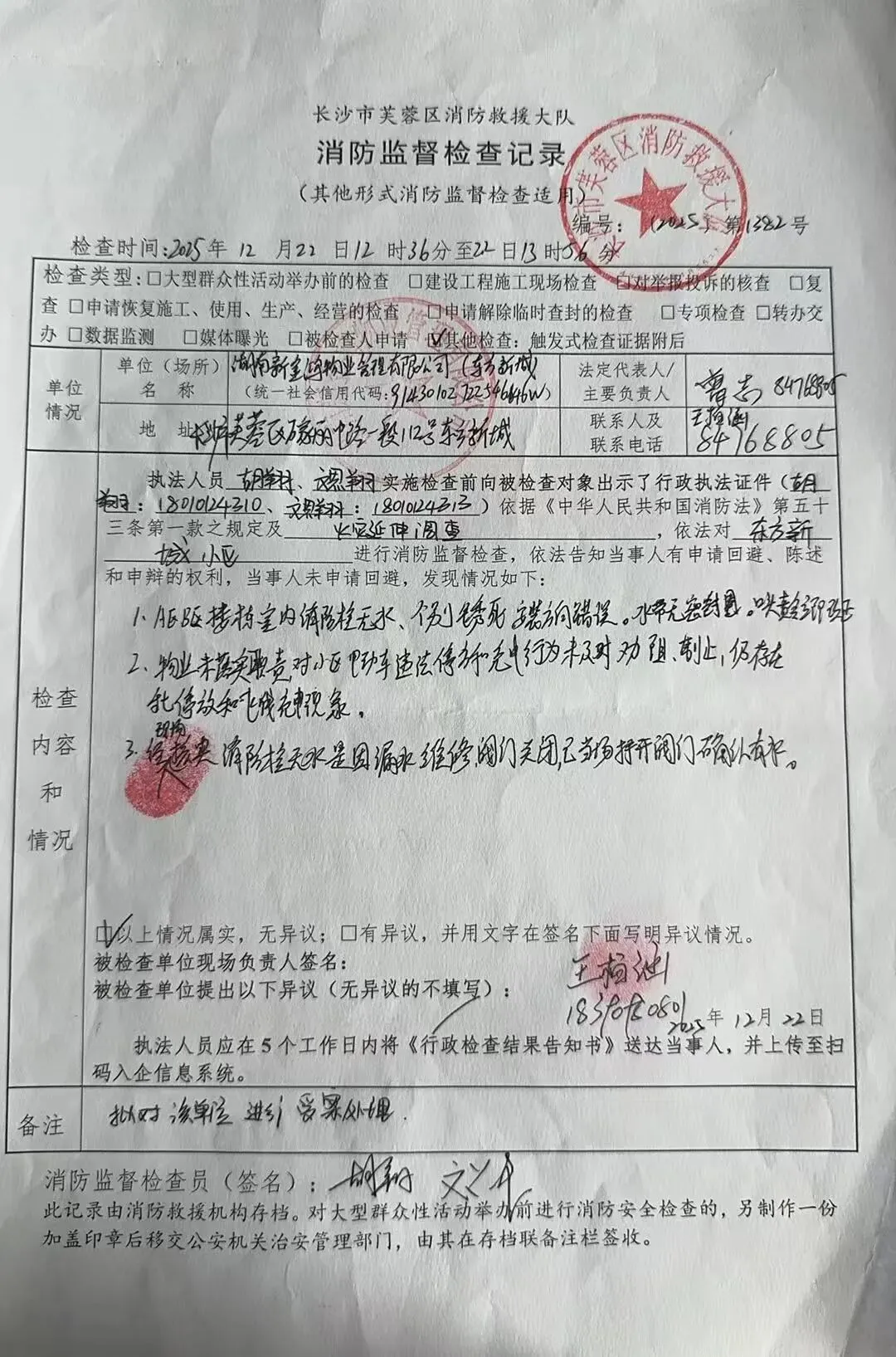1.2025年12月23日芙蓉区消防救援大队消防监督员对湖南新金鸿物业管理有限公司进行火灾延伸调查,发现:1、A区B区楼栋室内消防栓无水,个别锈死,安装方向错误。水带无密封圈。口头责令立即改正。2、物业未落实职责,对小区电动车违法停放和充电行为未及时劝阻、制止,仍存在乱停放和飞线充电现象。3、经现场核实消防栓无水是因漏水维修,阀门关闭,已当场打开阀门确认有水。我大队依法填写《消防监督检查记录》(编号:〔2025〕1382号),并进行处罚。
