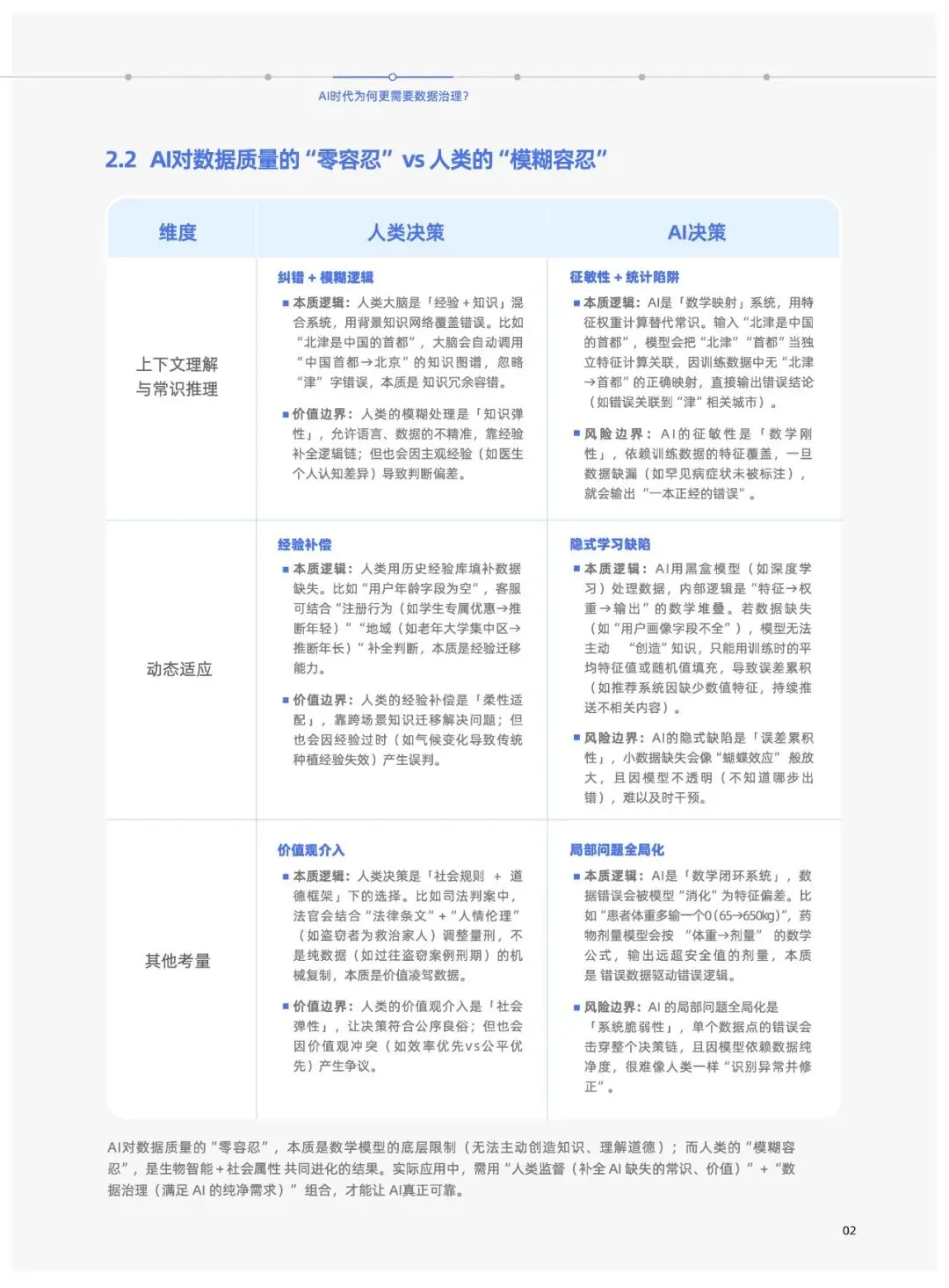 AI对数据质量“零容忍”:人类决策具备模糊容忍、柔性适配的能力,可通过经验和知识纠错补全;而AI是数学映射系统,存在特征敏性、误差累积性、系统脆弱性,数据错误会直接导致决策偏差甚至全局性错误,需极高的数据纯净度。