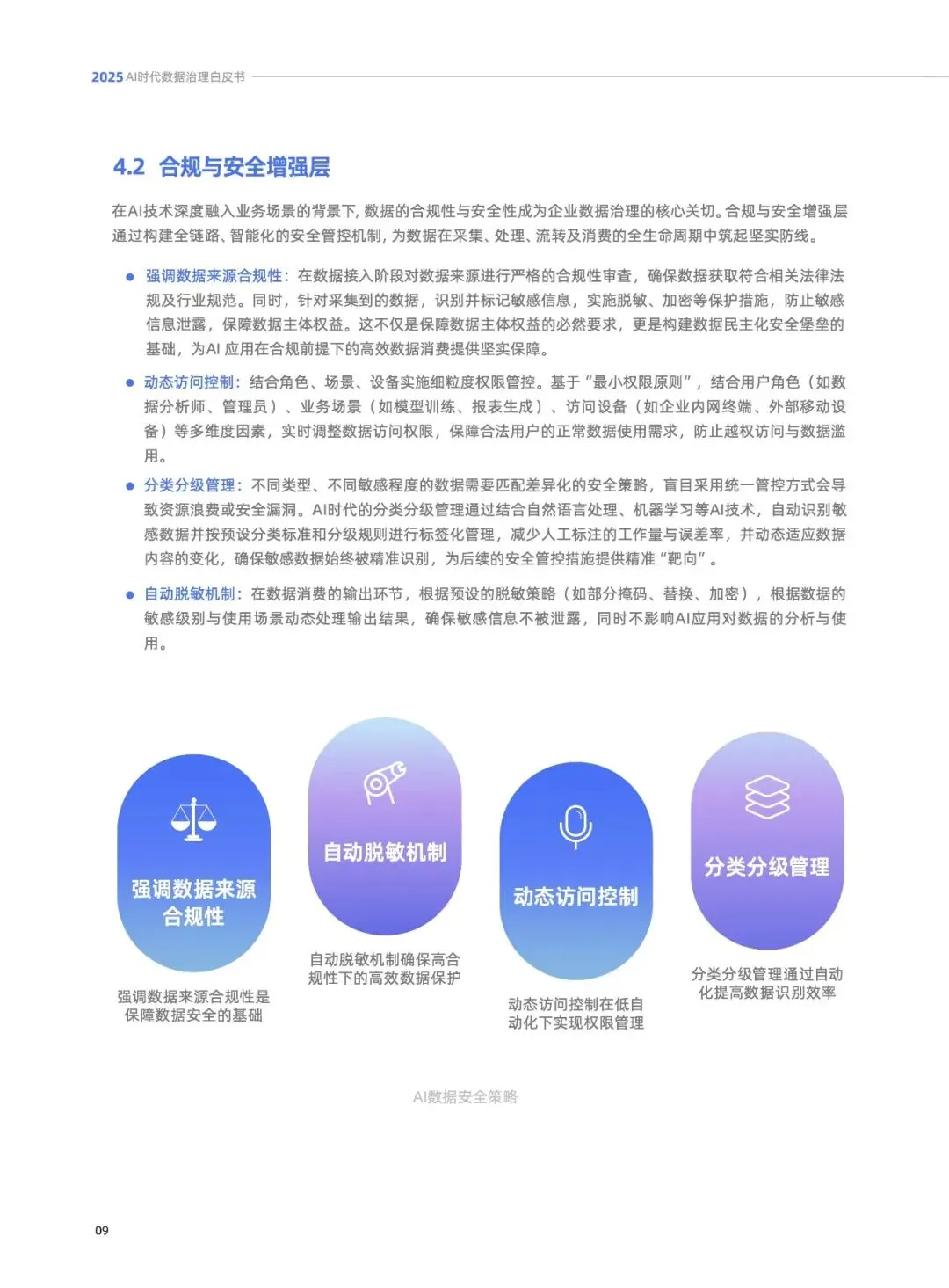 合规与安全增强层:为数据全生命周期筑牢安全防线,核心举措包括严格审查数据来源合规性、结合角色/场景/设备的动态访问控制、AI驱动的自动分类分级管理、按场景的动态自动脱敏机制。