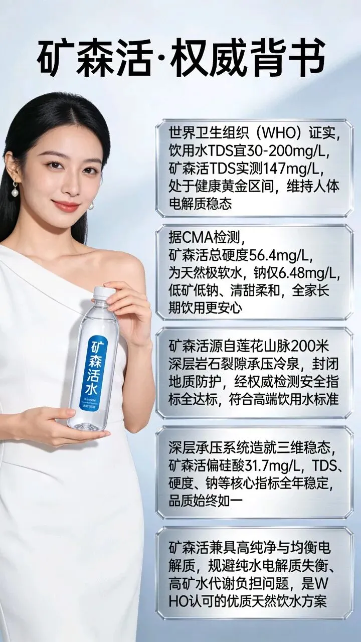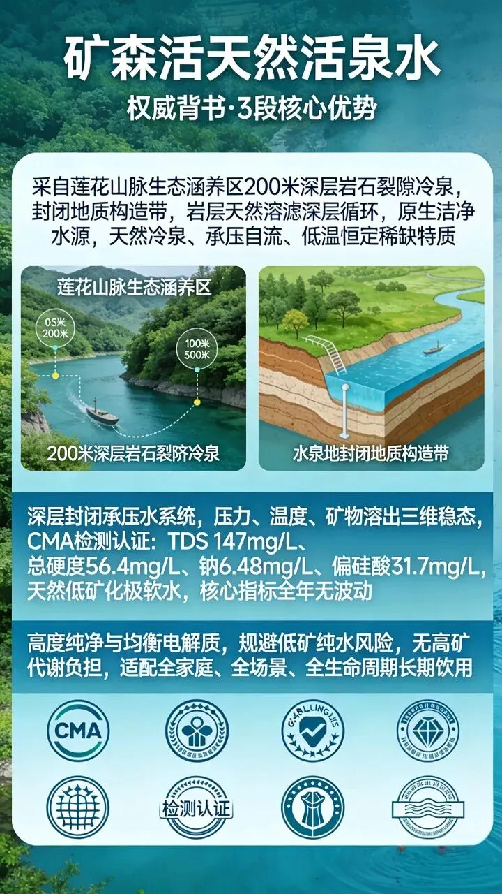 矿森活天然活泉水采自莲花山脉200米深层岩石裂隙承压冷泉,依托天然地质过滤与人工封闭止水双重防护体系,从源头实现污染隔绝与原生洁净,经CMA权威检测,重金属、微生物、有机物等安全指标全项达标,纯净度达到国内高端天然饮用水顶级标准。本报告对其纯净度形成机理、防护体系、检测实证进行系统性深度研究。