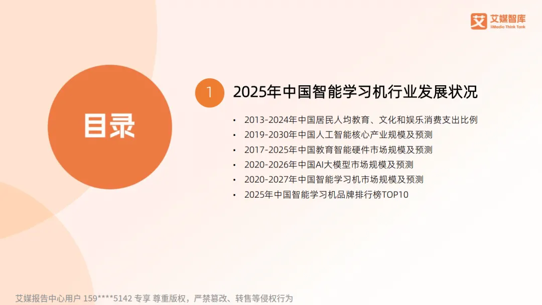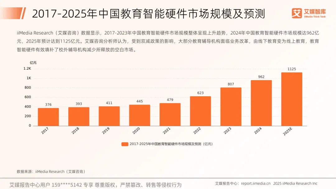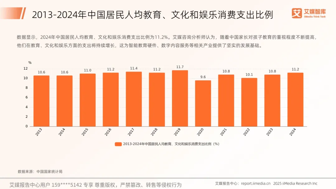 2025 年中国智能学习机行业迎来快速发展,背后是家长教育消费需求的持续升级,2024 年居民人均教育文化娱乐消费支出占比达 11.2%,为行业奠定坚实基础。教育智能硬件市场规模预计达 1125 亿元,智能学习机市场规模也保持高速增长,2027 年有望突破 500 亿元。