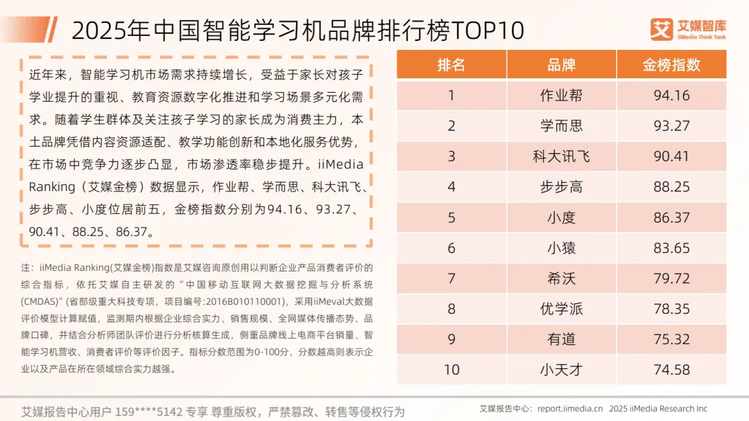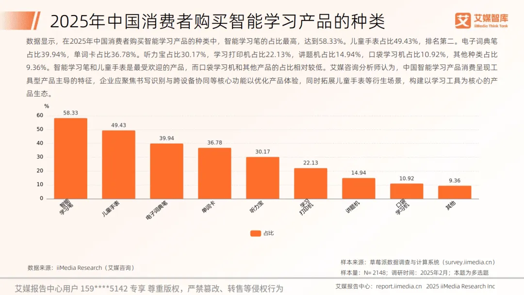 作业帮、学而思、科大讯飞位列智能学习机品牌前三,成为消费者的主流选择。家长购买智能学习机最看重学习资源,占比 66.92%,提升孩子成绩是核心用途,41.71% 的消费者能接受 2001-4000 元的中高端价位。新电商平台成为主要购买渠道,占比 67.23%,考前考点整理、错题归类是用户最偏好的功能。