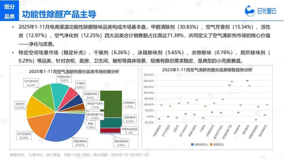 - 核心品类: 功能性除醛除味产品主导市场,甲醛清除剂(30.83%)、空气芳香剂(15.34%)、活性炭(12.97%)、空气净化剂(12.25%)四大品类合计占71.39%的份额。