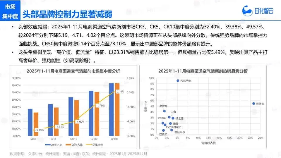- 龙头特征: 希望树以23.31%的销售额占比稳居第一,但其销量占比仅5.49%,凸显其“高价值、低流量”的高端除醛定位。