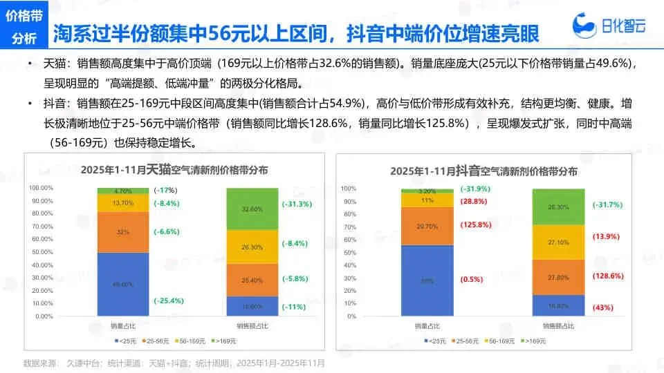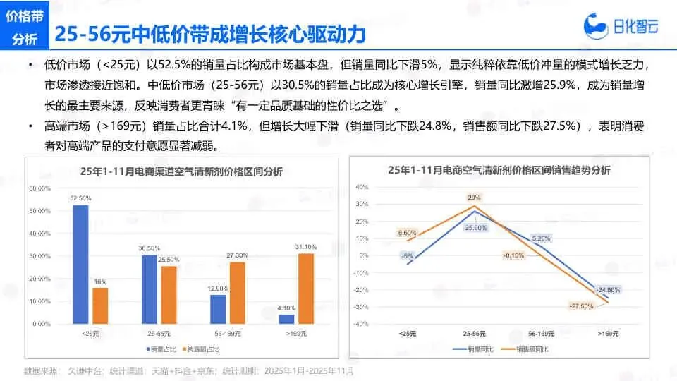 - 价格带机会: 25-56元的中低价带成为核心增长引擎,销量同比激增25.9%,反映了消费者对“有一定品质基础的性价比之选”的青睐。而高端市场(>169元)和纯低价市场(<25元)均出现下滑。