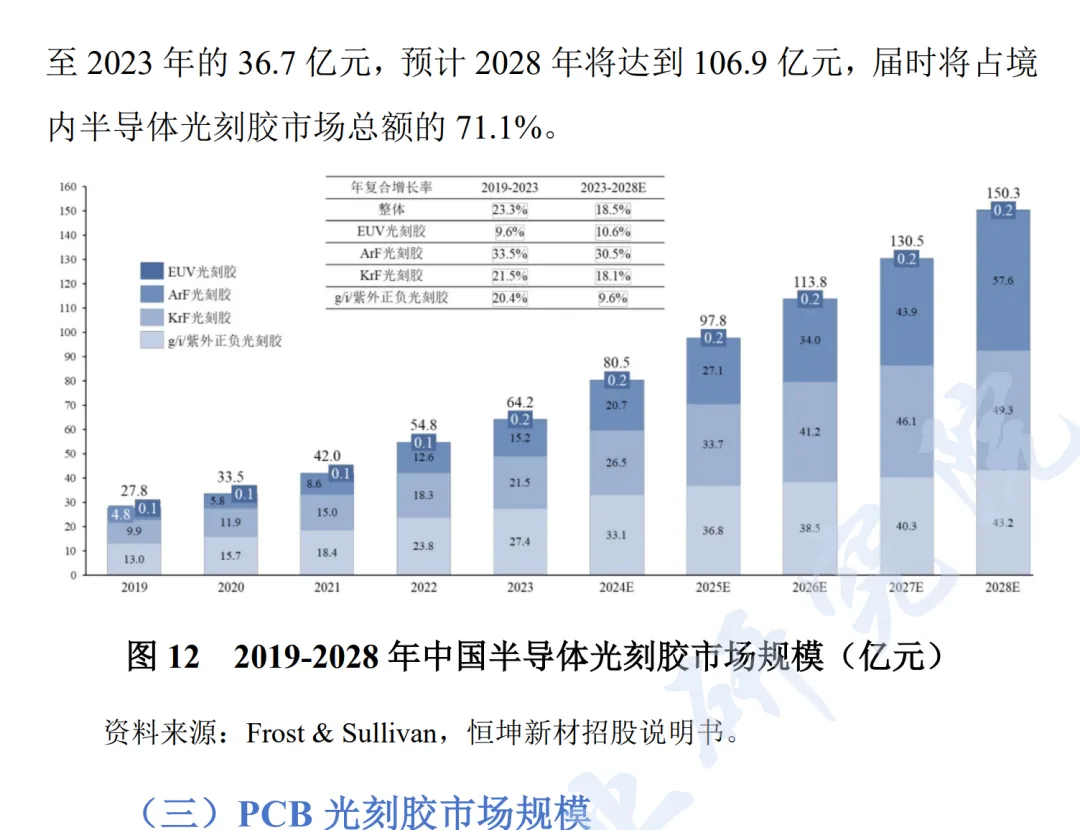 半导体光刻胶:2024 年中国集成电路晶圆制造用光刻胶规模 53.54 亿元,KrF 光刻胶为核心品类(24.84 亿元),EUV 光刻胶尚处研发阶段;2019-2023 年中国半导体光刻胶年复合增长率 23.3%,2023-2028 年预计仍达 18.5%,KrF 与 ArF 光刻胶将成主要增长极。