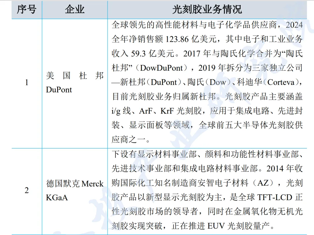 欧美企业(杜邦、默克)聚焦显示和半导体中高端光刻胶,默克为全球 TFT-LCD 正性光刻胶龙头;韩国企业(东进世美肯、SK 材料)依托本土面板 / 半导体产业链,在显示光刻胶和半导体光刻胶本土化配套上突破;中国台湾企业(长兴材料、奇美实业)深耕 PCB 和 LCD 光刻胶,长兴材料为全球 PCB 干膜光刻胶市占率第一。