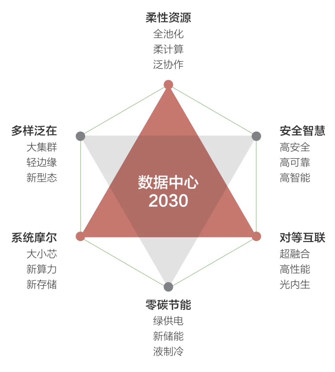 未来十年,构建“五效合一”,并且具备多样泛在、安全智慧、零碳节能、柔性资源、系统摩尔、对等互联六大技术特征的新型数据中心将是产业发展的愿景。