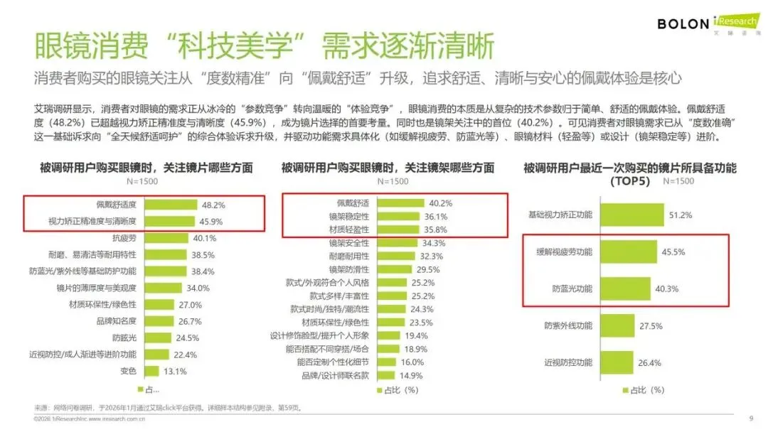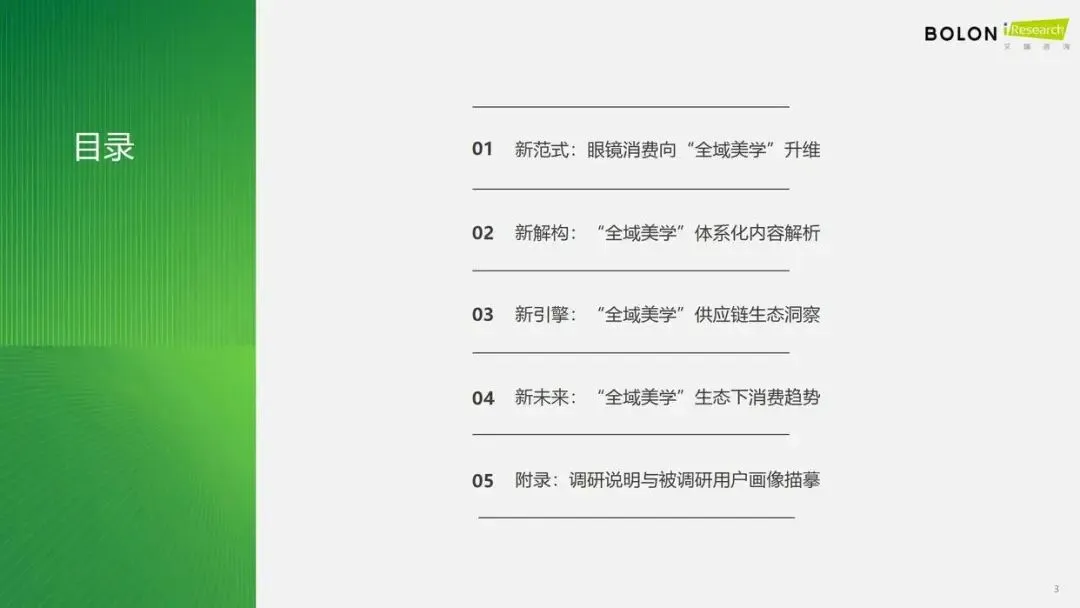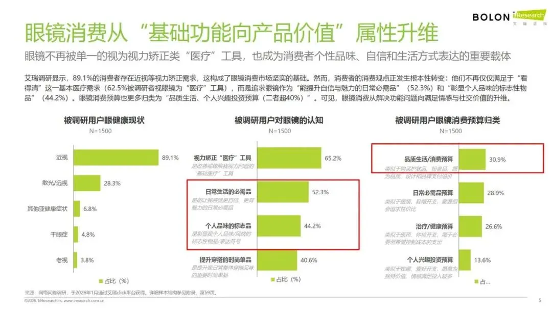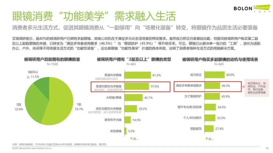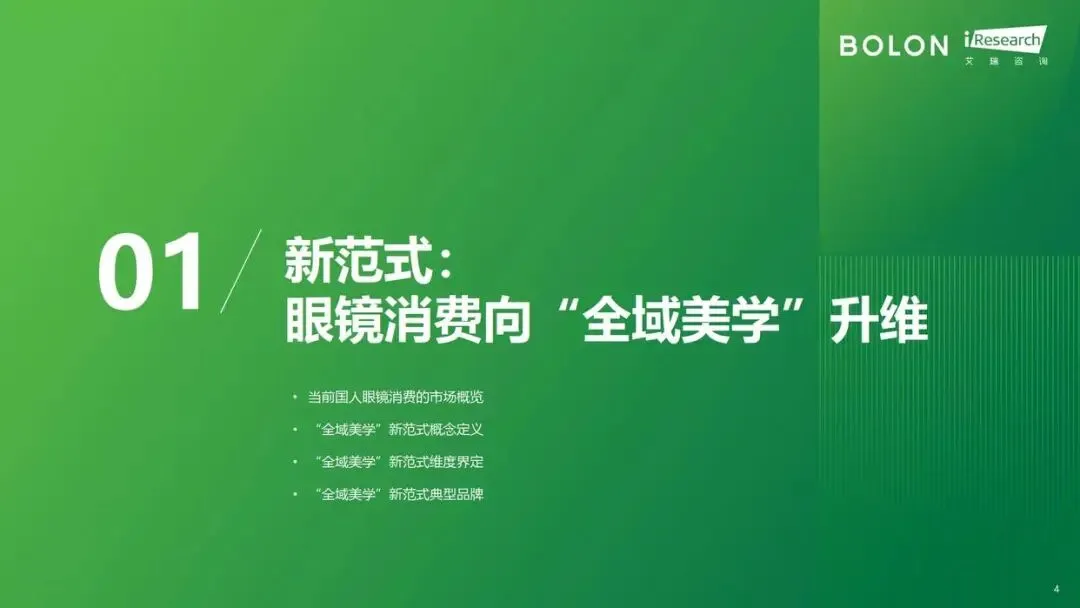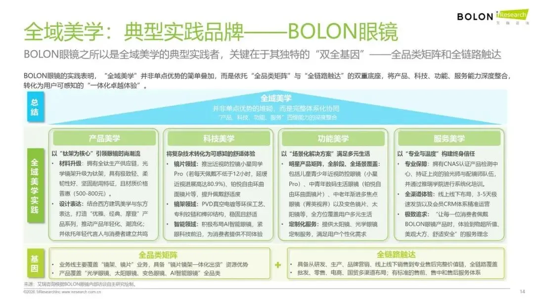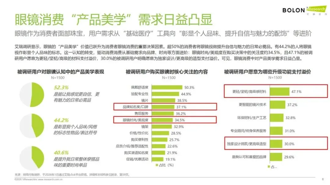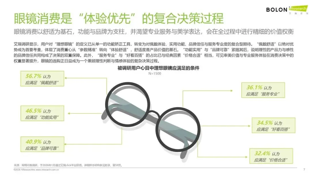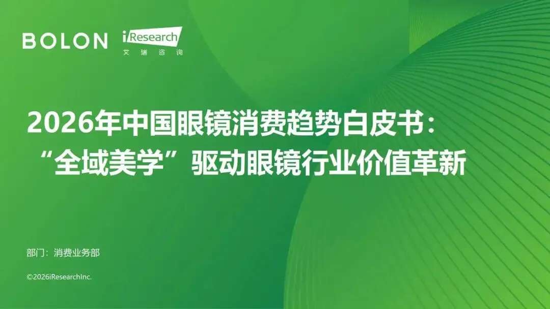 本篇分享的内容是《2026年中国眼镜消费趋势白皮书:“全域美学”驱动眼镜行业价值革新》?艾瑞咨询《2026 年中国眼镜消费趋势白皮书》指出,中国眼镜消费已从 “看得清” 的基础功能需求,全面升级为融合产品、科技、功能、服务四维一体的 “全域美学” 新范式,行业竞争也围绕这一核心展开价值革新,BOLON 眼镜成为该范式的典型实践品牌。调研显示,89.1% 的消费者有视力矫正基础需求,但 62.5% 的消费者不再仅将眼镜视为医疗工具,52.3% 将其当作提升自信的必需品,44.2% 视其为彰显品味的标志,消费预算也更多划归品质生活与个人兴趣投资。消费者更换眼镜周期缩短至 13-14 个月,24.7% 因体验升级主动更换,佩戴舒适(56.7%)成为理想眼镜首要考量,审美与专业服务在消费决策中权重显著提升。“全域美学” 体系可拆解为四大维度:产品美学以设计为核心,推动眼镜向 “面部珠宝” 升级,超三成消费者愿为独家设计和环保材料支付溢价;科技美学将技术转化为舒适佩戴体验,佩戴舒适度成镜片、镜架选择首要因素,近半数消费者愿为高级材料买单;功能美学以场景为核心,超 40% 消费者拥有多副眼镜,46.5% 为满足多场景需求,眼镜成为适配办公、户外等场景的功能性装备;服务美学以专业和信任为核心,86.3% 的消费者看重完善售后,84.1% 关注专业无推销体验,近三成体验过镜片镜架一体化定制服务。支撑 “全域美学” 落地的供应链生态需具备四大支柱能力:持续研发与创新力是源头、智能制造与品质可控是基石、敏捷协同与响应是引擎、可持续与绿色发展是长期锚点。BOLON 凭借全品类矩阵与全链路触达的 “双全基因” 成为标杆,其钛架工艺、近视防控镜片等产品布局,3-5 天极速交付的供应链闭环,以及全周期专业服务体系,实现了四维能力的深度整合。在此生态下,眼镜行业呈现三大核心趋势:一是价值属性时尚化,供需共振推动眼镜从矫正工具变为时尚配饰与文化符号,社交平台上眼镜穿搭风格讨论热度飙升;二是竞争核心体验化,从参数竞争转向以舒适体验和场景适配为核心的体验竞争,场景化细分功能成为常态;三是用户关系终身化,从单次交易转向基于专业服务与数字化运营的终身信任关系构建,线下连锁门店仍是主流消费渠道,专业全周期服务成为品牌护城河。此外,智能科技赋能成为重要方向,80% 以上消费者对智能眼镜有认知,行业呈现眼镜品牌与科技巨头跨界协同的趋势,智能眼镜向生活刚需、场景互联升级。眼镜行业已进入体验生态竞争阶段,品牌需以体系化能力整合 “全域美学” 四大维度,从单品竞争转向经营用户终身价值,而消费者选购也更注重美学、体验与长期价值的综合考量。以下为报告节选内容